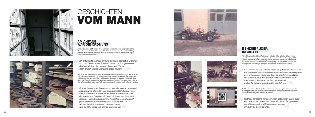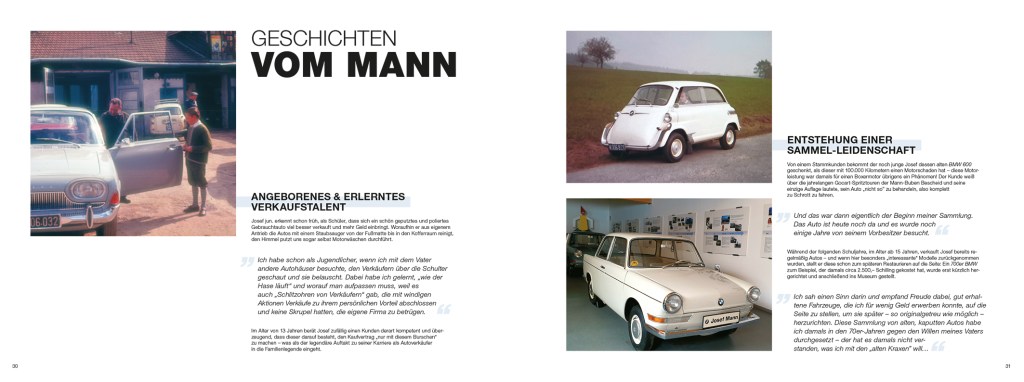 Das großformatige Jubiläums-Buch (in limitierter Auflage) gibt einen kleinen Rückblick auf die Geschichte vom Autohaus Mann und einen großen Einblick in die noch größere Sammelleidenschaft des Vaters und Schwiegervaters Josef Mann sen., was „besondere“ BMW-Modelle angeht. „Besonders“ nicht nur in der Entwicklungsgeschichte dieser Marke, sondern vor allem durch die Geschichten, die ihre Besitzer – es waren meistens mehrere – damit verbinden.