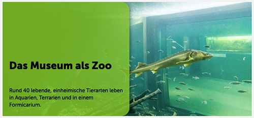 Hintergrund: Das Museum Niederösterreich in St. Pölten steht für die Verbindung von MENSCH, NATUR und KLIMA. Im Haus für Natur leben auch 40 einheimische Tierarten in Aquarien, Terrarien und in einem Formicarium. In den »TIERGESCHICHTEN« erzählen sechs heimische Tiere selbst über ein Thema, das besonders charakteristisch für ihr Leben ist. So können die Besucher spielerisch Neues über Säugetiere, Vögel, Reptilien, Amphibien und Fische in Niederösterreich lernen.