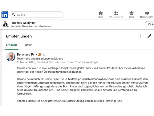 Dankschreiben / Empfehlung des Autors auf LinkedIn